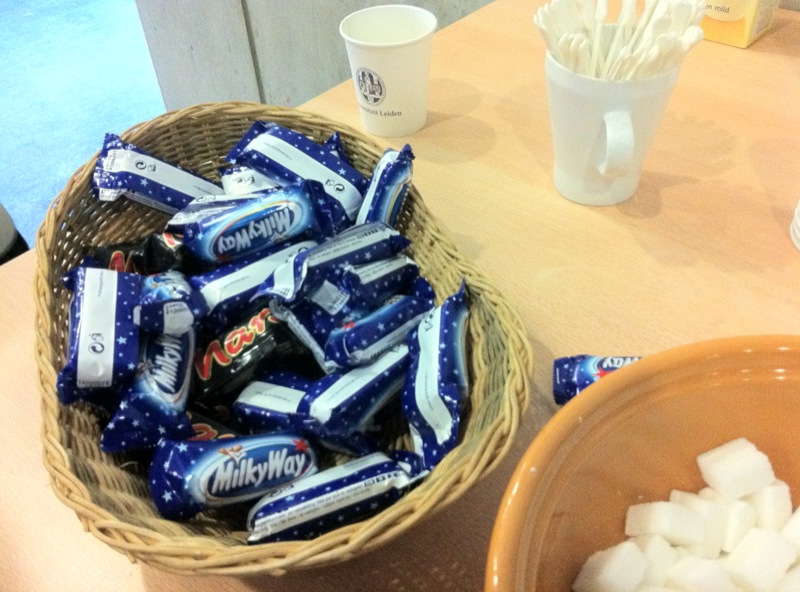 Ali po naše Observatorij Znanost Dan. :D Tako malo po Google Translate. Lahko se kdo potrudi z lepim slovenskim prevodom (in the comment section below). :) Zelo fin dan, ki je minil v poslušanju predavanj in seminarjev velike večine zaposlenih in doktorskih študentov, ki si predstavili sveža odkritja, tekoče delo, novice iz projekta ALMA, E-ELT, itd. Da pa poslušalci nismo ravno zaspali, sta bila na voljo kava in čaj v neomejenih količinah in posladki v tipično astronomskem stilu (več med fotografijami). Za vse so priskrbeli tudi prijetno kosilo in na koncu še tradicionalni borrel. Gre za tipično nizozemsko navado, vsak teden, ob petkih ob koncu šihta se gre na pijačo in prigrizke. Tako je bilo tudi danes, na voljo belgijska in nizozemska piva, vino, sokovi, siri, krekerji, … In zelo prijetno vzdušje za poklepetat z ostalimi. O astronomskih temah, o navadah prehranjevanja, o fajnih gostilnah v mestu, … Fino. Prilagam seveda nekaj utrinkov.