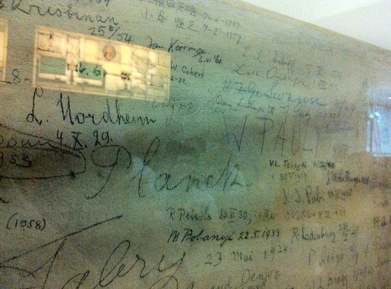In za konec še tabla, kamor se podpisujejo osebe takšnega kova, ko pridejo sem na kak kolokvij. Tam nekje desno je še Dirac, …