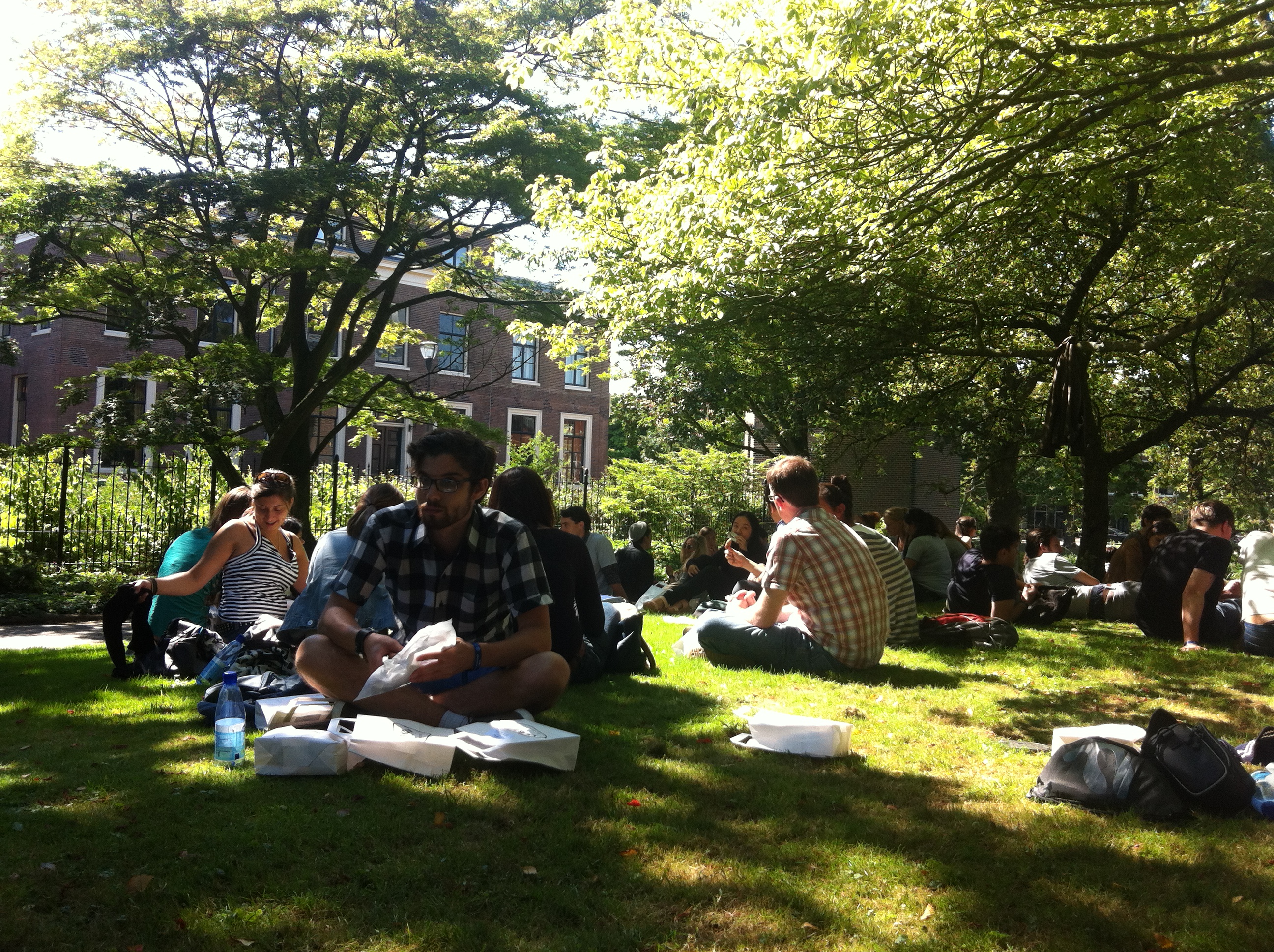 Danes pa je bil čas za prvi dan orientacijskega tedna. Ena beseda! AWESOME! Toliko novih ljudi, še več različnih zgodb in običajev, navad in veselja! Sedaj poznam že nekaj sošolcev iz astronomije. Dva kanadčana, indijca, avstrijko, … Pisana druščina bomo. Dan je minil v spoznavanju mesta, nagovorih župana in rektorja v protestantski cerkvi, kosila v botaničnem vrtu … In celo vreme je tipično ne-nizozemsko. Sončno in toplo.
