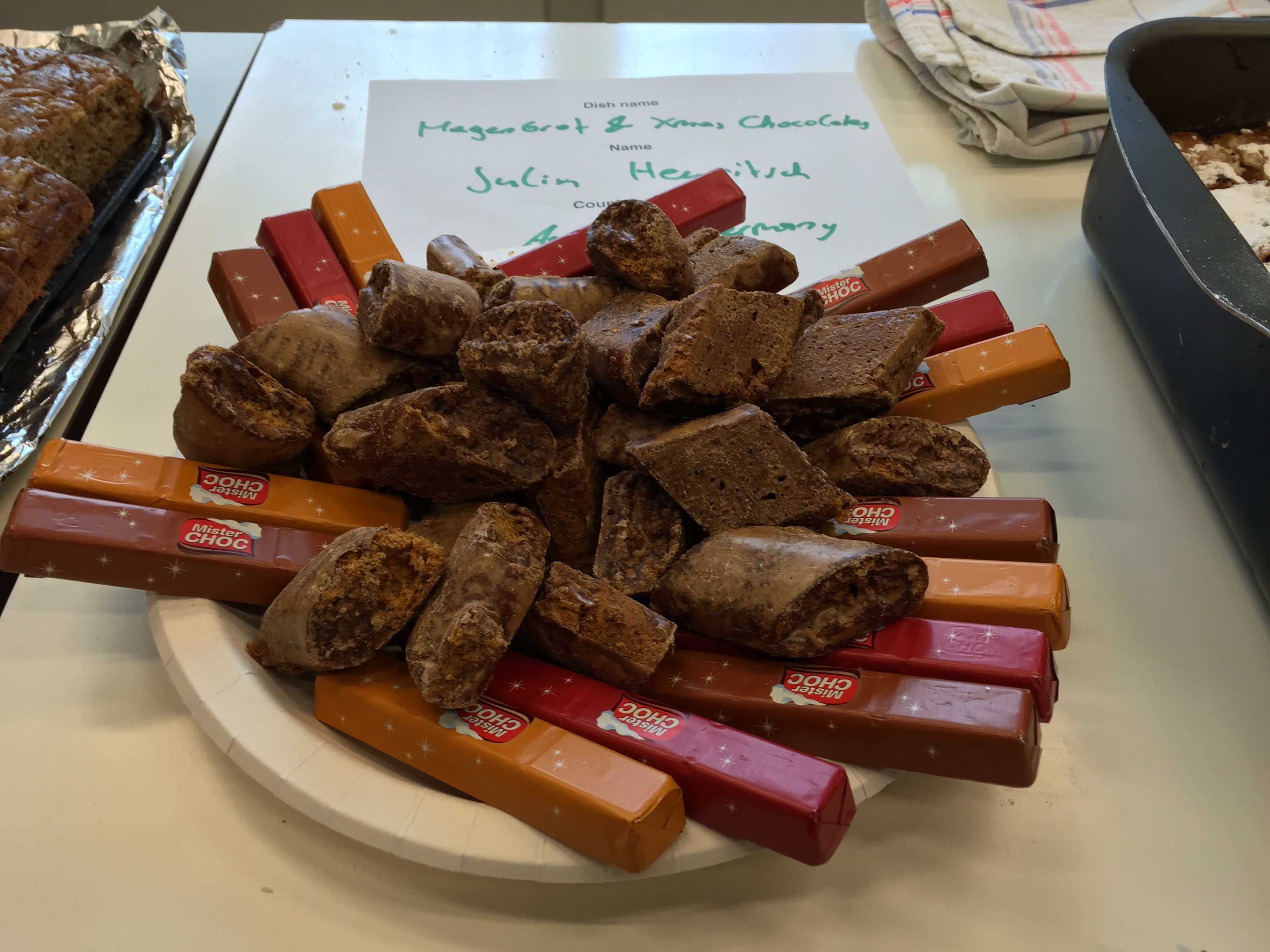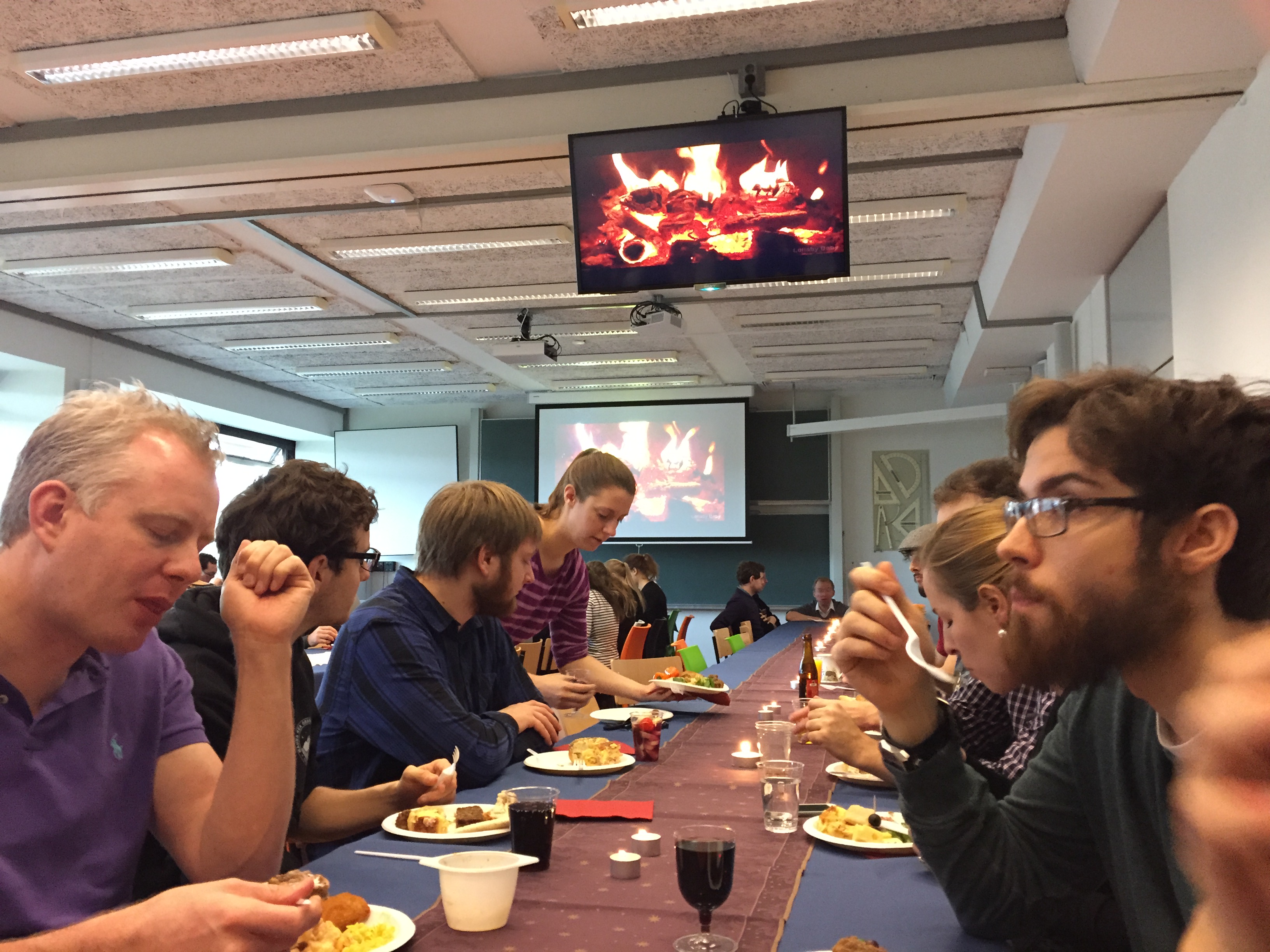 Kot je vsako leto v navadi na observatoriju, je tudi to leto potekalo božično kosilo, kjer se zbere večina profesorjev, doktorskih študentov in nas, ki šele končujemo drugo bolonjsko stopnjo. Kosilo poteka tako, da vsak prinese eno tradicionalno (ali pa tudi ne) božično jed in se nato naredi bife, kjer poskušaš poskusiti vsako jed. Na koncu smo bili vsi zelo siti od vseh dobrot. Prav tako direktor observatorija pripravi kratek govor in podeli darila za izjemne dosežke v preteklem letu. Ker lani nisem prispeval nič k hrani, sem se tokrat poskusil oddolžiti s prekmursko gibanico. Delal sem jo prvič in moram reči, da je kar uspela. No na koncu je ni ostalo niti za makovo seme (razen par tistih, ki sem jih dan prej moral sesati po tleh … :P ).